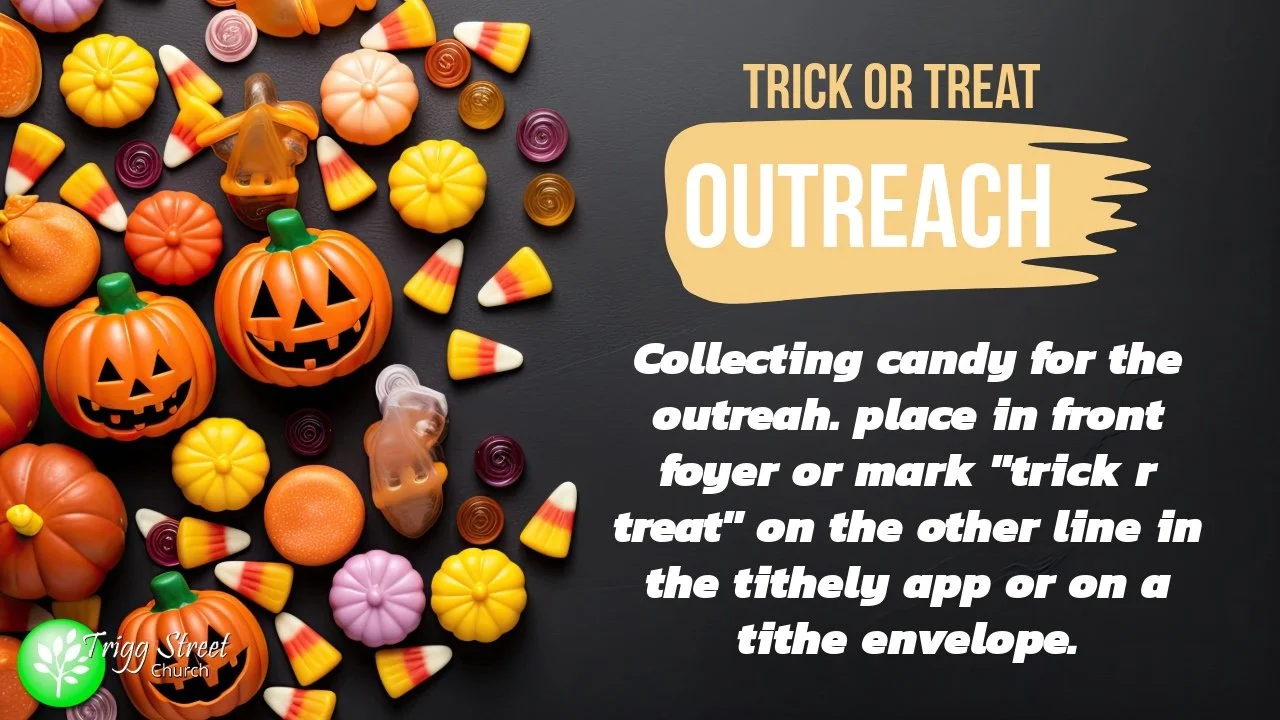 We are collecting individually wrapped candy for our annual Halloween outreach. Please drop off your donated candy in the foyer. Alternatively, you can give a monetary donation by marking "trick ‘r treat" on the other line in the Tithely app or on a tithe envelope. Thank you for helping us share joy in our community!