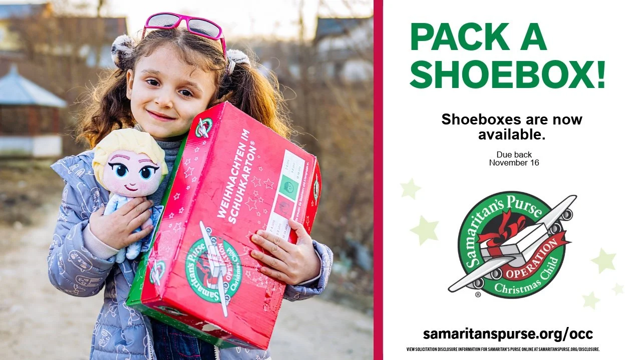 Operation Christmas Child is back. Shoeboxes will be available starting August 3. Filled boxes will be due back no later than November 16. See Tim Estes if you have any questions.