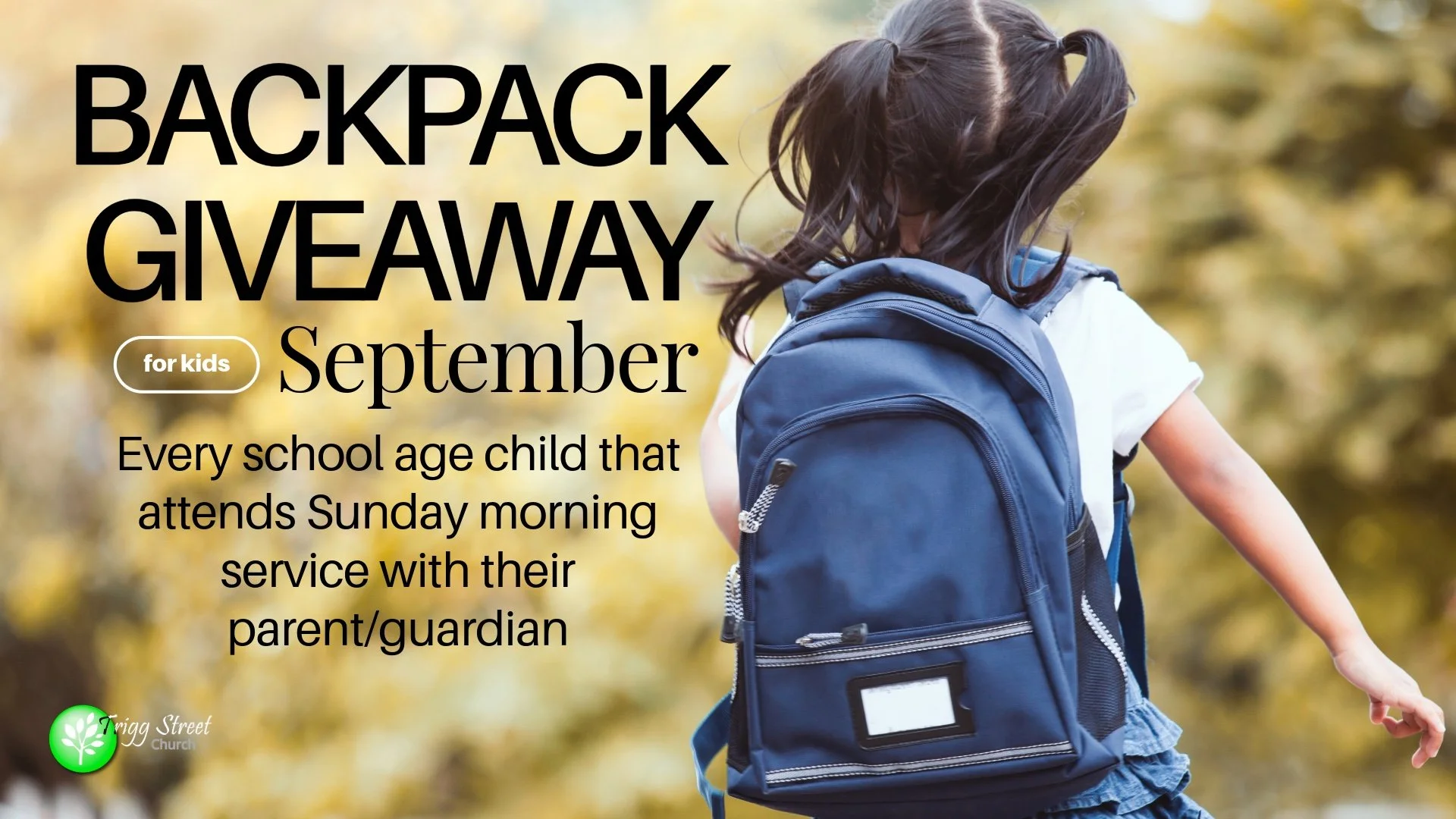 Special announcement for kids. For the entire month of September we are going to be giving a backpack to every school age child that attends Sunday morning service with their parent/guardian, while supplies last. This is made possible by an anonymous donor being obedient to God.