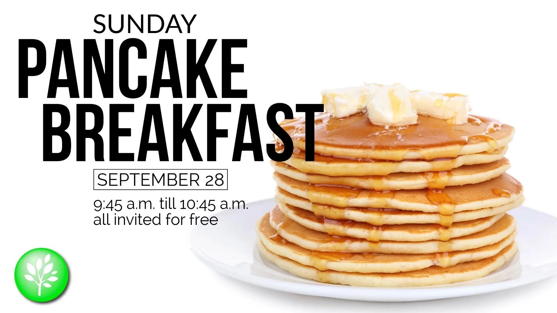 Everyone is warmly invited to join us for a free pancake breakfast on September 28, taking place from 9:45 a.m. to 10:45 a.m. We look forward to sharing this meal together then having service.